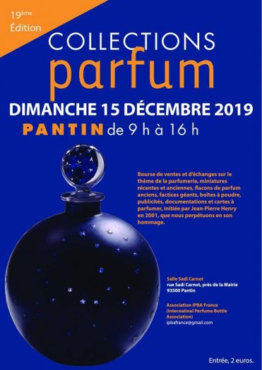 COLLECTION PARFUM est une bourse très conviviale de ventes et d’échanges sur le thème de la parfumerie, miniatures récentes et anciennes, flacons de parfum anciens, factices géants, diverses boîtes à poudre et publicités.
